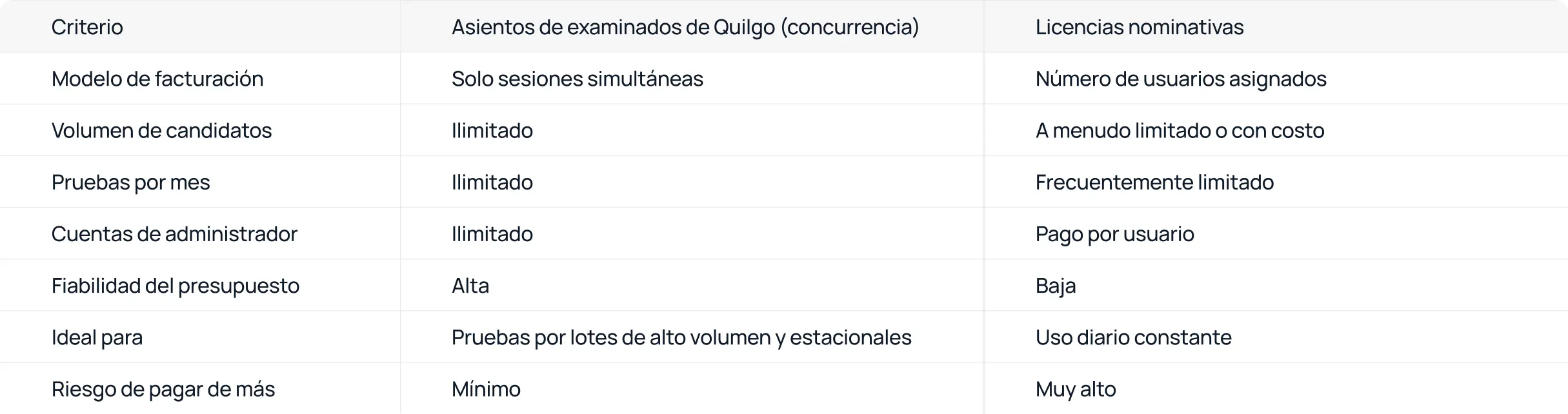 El modelo de asiento para examinados de Quilgo está diseñado para evaluaciones modernas, escalables y de gran volumen. Ofrece capacidad de prueba y usuarios ilimitados, y los costos se basan en el uso real y no en el número excesivo de usuarios o los límites de prueba.